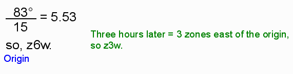 6) Since zone middles are in increments of 15°, one may easily determine the middle of any zone. For instance, the middle of zone 3 west will be 3 increments of 15° to the west of the prime meridian or 45° west.