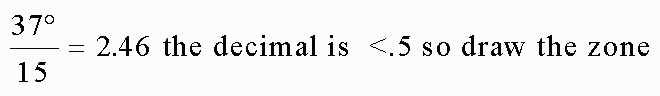 1) Since zone middles are all increments of 15° away from the Prime Meridian (0°), we may estimate which zone any longitude is in by dividing its degrees of longitude by 15.The decimal rules are proven below.2) If, when you divide a location's degrees of longitude by 15, the decimal is less than 0.5, you must draw the zone to see if the location falls within the estimated zone.