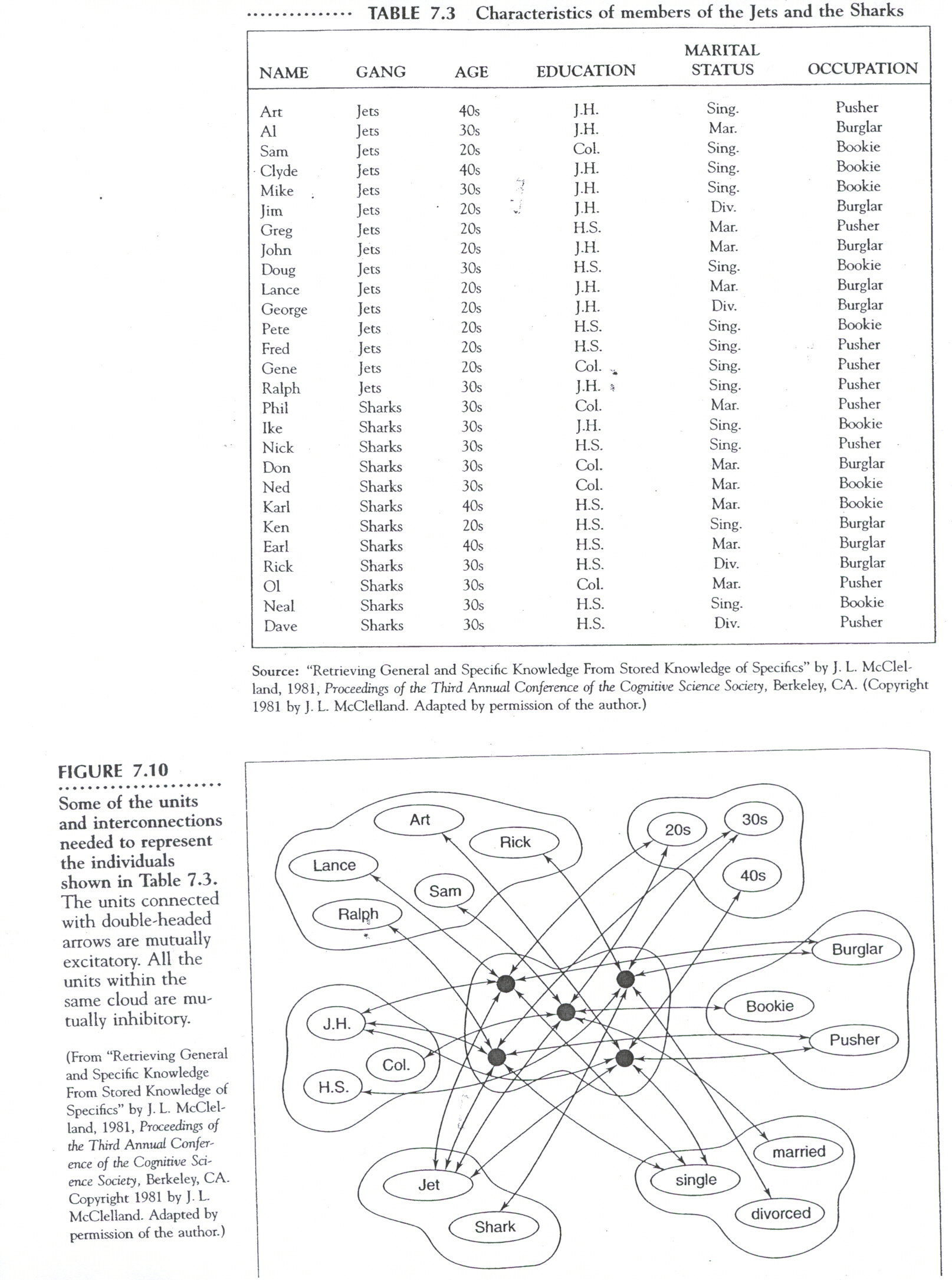 It also has the emergent property of being capable of "Spontaneous Generalization". Suppose you teach the network all of the people and their characteristcs. But suppose that there are patterns in the characteristics. Perhaps the burglars are more likely to be younger and single, whereas the bookies tend to be older and married or divorced. Now suppose you introduce a new person, but leave out the information about the "occupation". However, this new person is young and single. Now if you ask for the names of all the burglars, the name of this new person will probably become active. Or if you ask for the occupation of the new person, then probably "burglar" will become active. In other words, the network generalizes what it "knows" (young, single gang members are more likely to be burglars than bookies), to the new person, and it does it spontaneously. That is, you do not have to teach the network anything special, or build it in any special way, for this to happen.